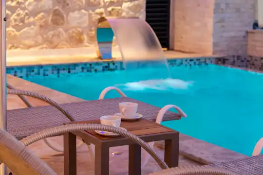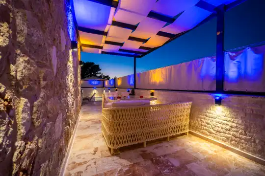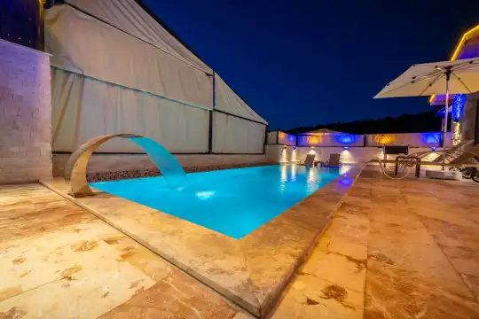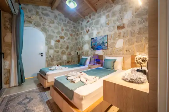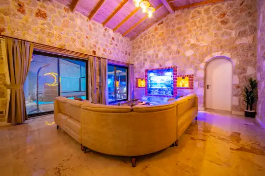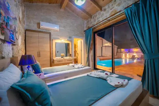 Kalkan Akbel mevkiinde yer alan bu özel tatil villası, 2 yatak odası ve 4 kişilik konaklama kapasitesiyle konforlu bir tatil sunar. Doğa ile uyumlu taş ve ahşap mimarisi, sıcak ve huzurlu bir atmosfer yaratırken, havuz terası mahremiyete önem veren misafirler için özel olarak tasarlanmıştır.