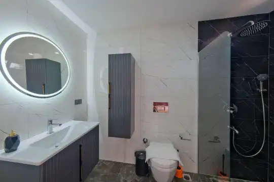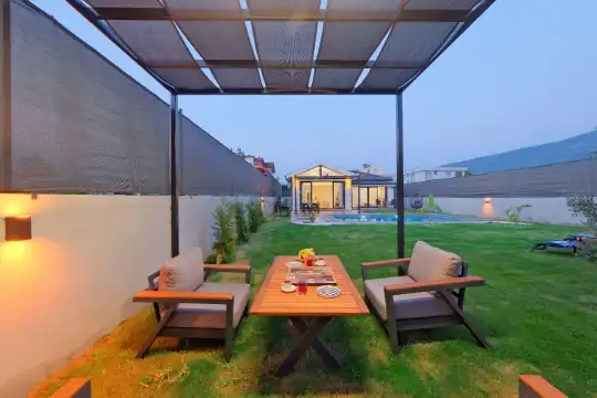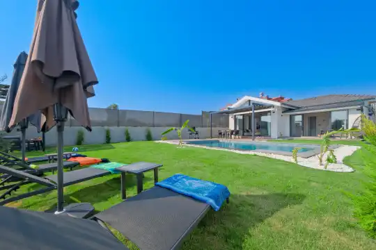 Merkezi konumuyla tercihlerin başında gelen villa, oldukça ferah ve geniş bahçe alanına sahiptir. Şezlong takımı, oturma grubu, salıncak ve barbekü alanı gibi olanaklarla donatılmıştır. Havuz terasına açılan zevkle döşenmiş konforlu oturma odası ve tam donanımlı mutfağı ile villanın iç mekanı da son derece konforlu ve moderndir. İki yatak odasında da çift kişilik yataklar bulunmaktadır.