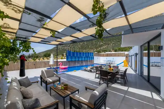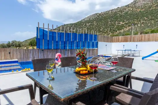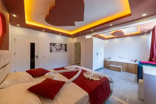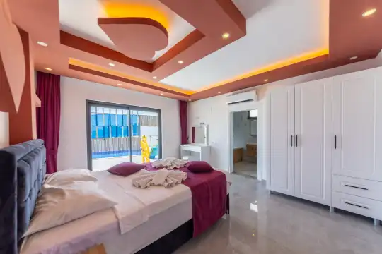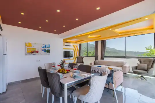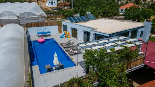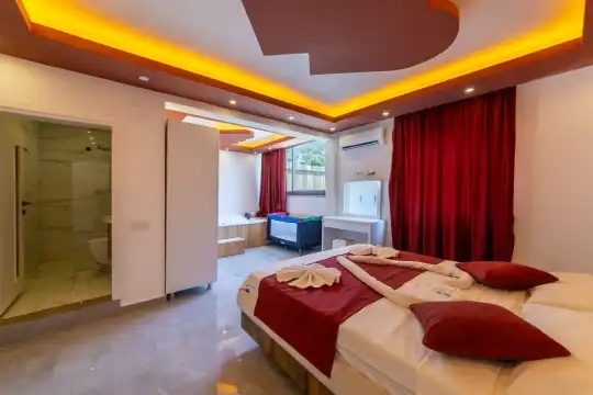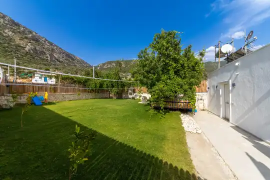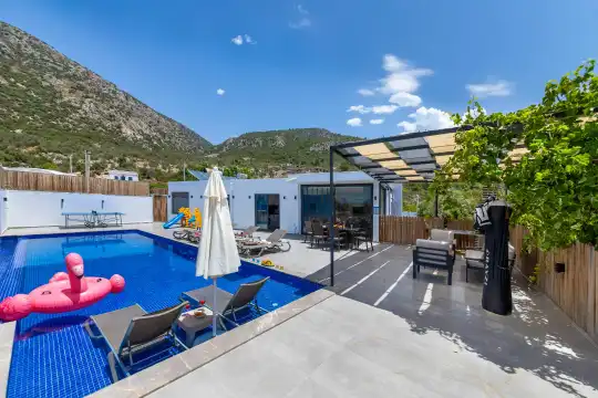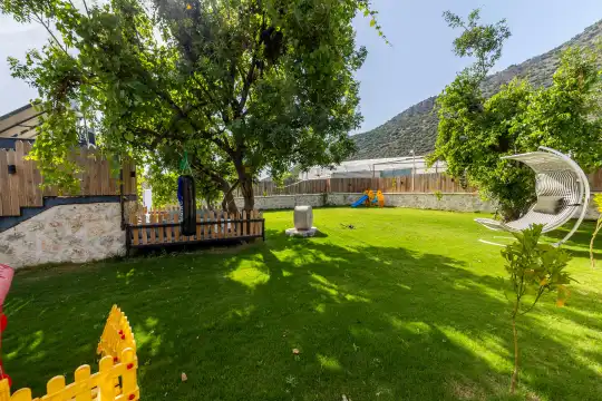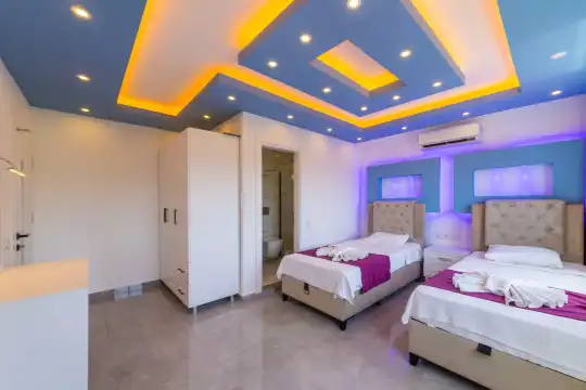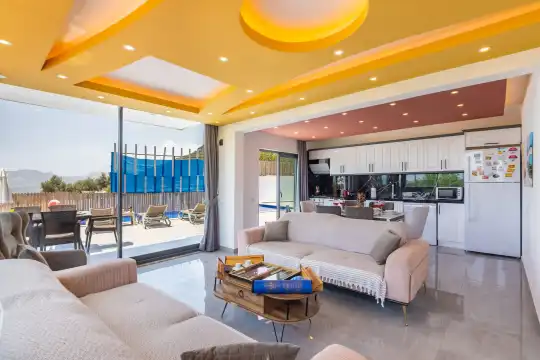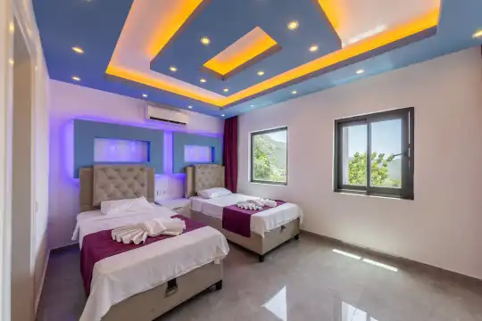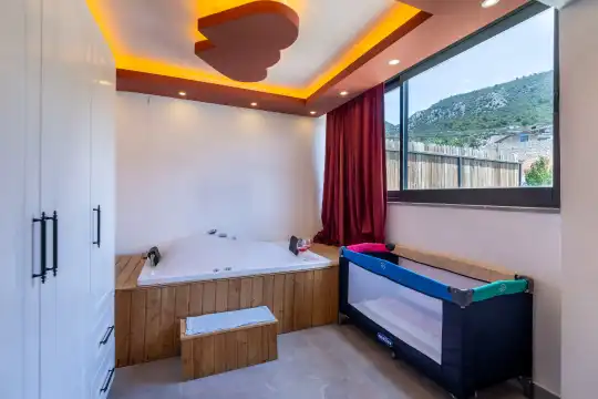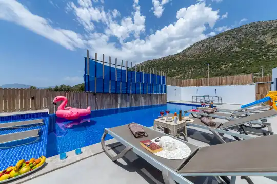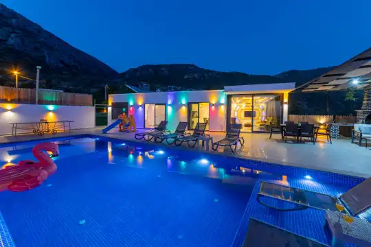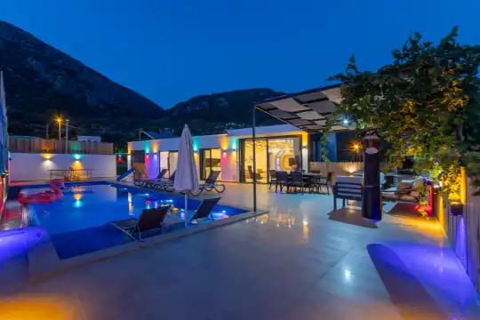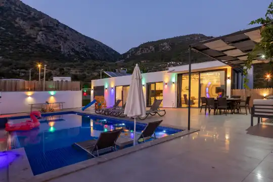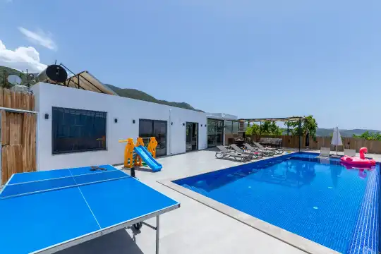 Kalkan Çayköy bölgesinde yer alan bu 3 yatak odalı, 6  kişilik tatil villası, misafirlerine keyifli olanaklar sunmaktadır. Villanın süit yatak odasında çift kişilik jakuzi ve akıllı yatak bulunurken, geniş bahçe alanında mini futbol, voleybol filesi, çocuk parkı, masa tenisi, langırt, kum torbası ve köşk gibi aktiviteler mevcuttur. Ayrıca, villa içinde okey takımı, tavla ve çeşitli kutu oyunları da keyifli vakit geçirmenizi sağlar.
