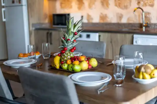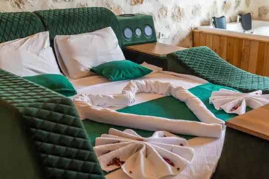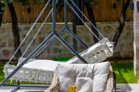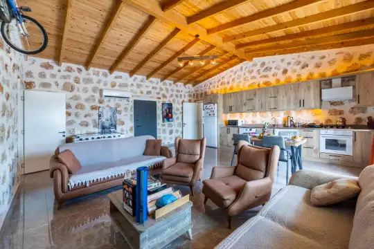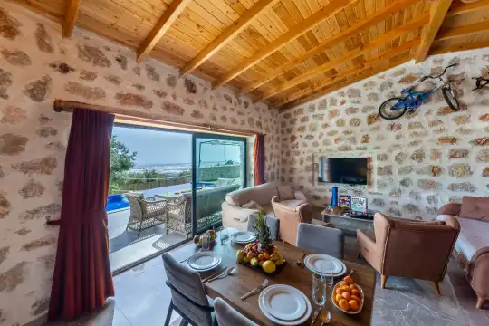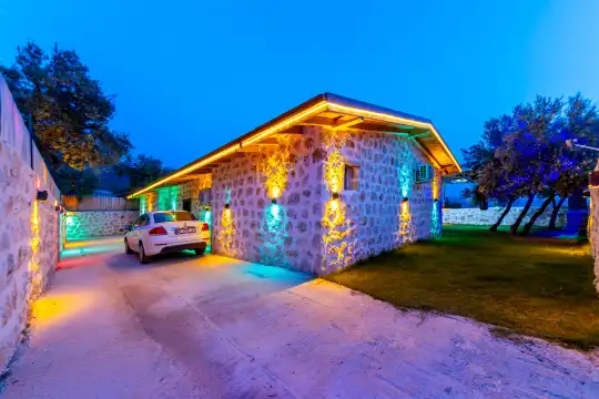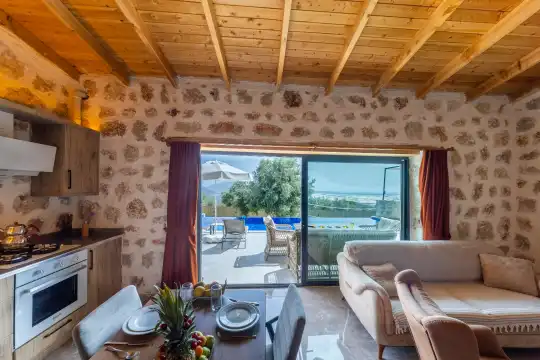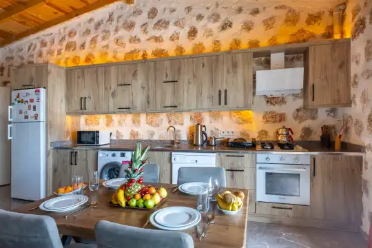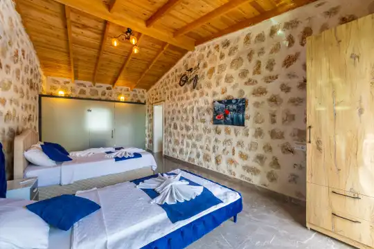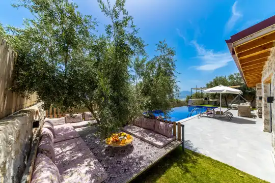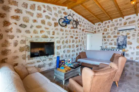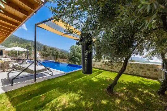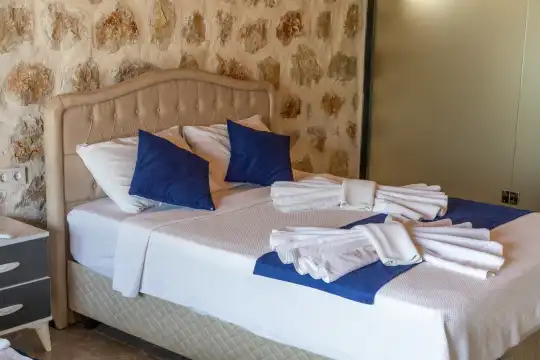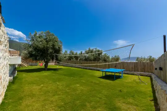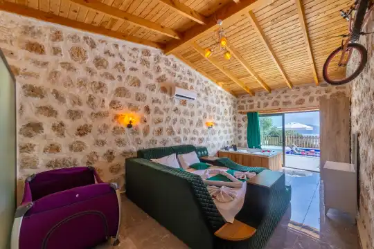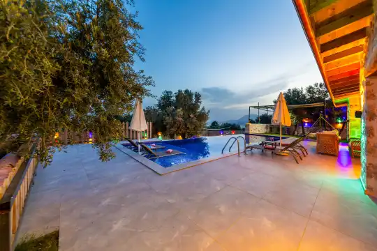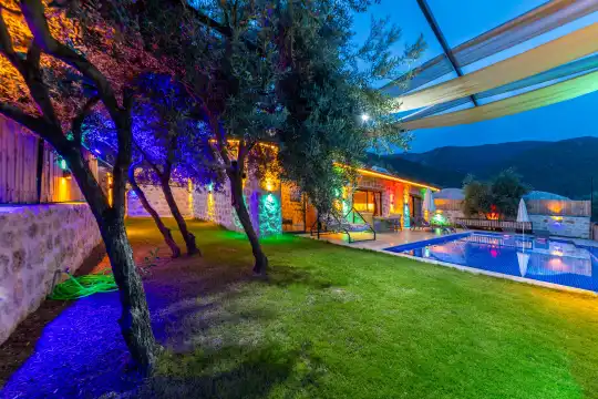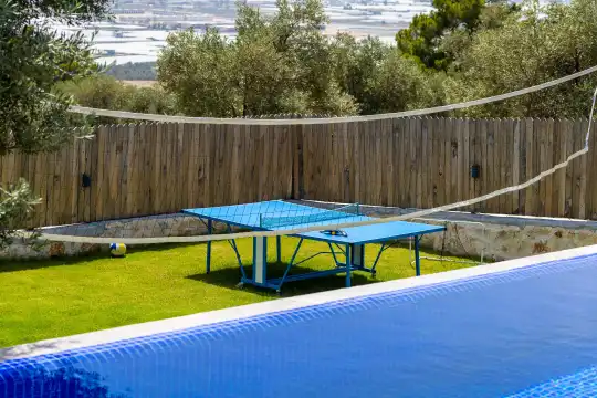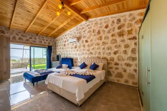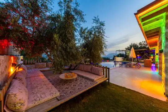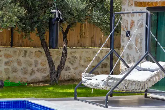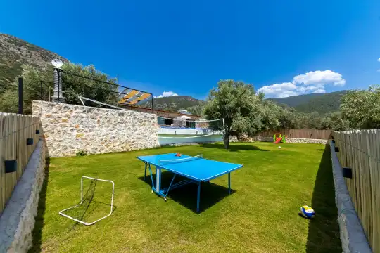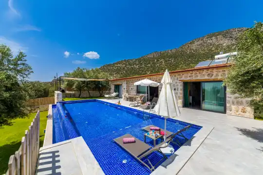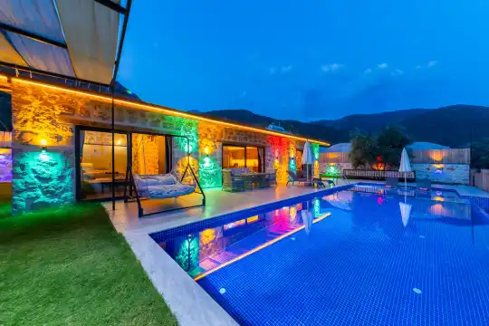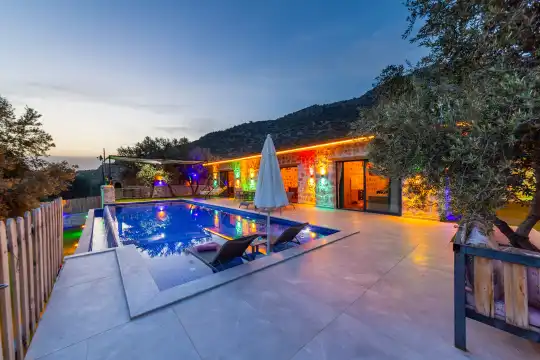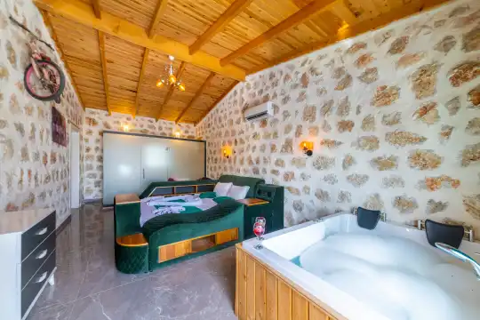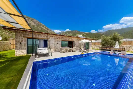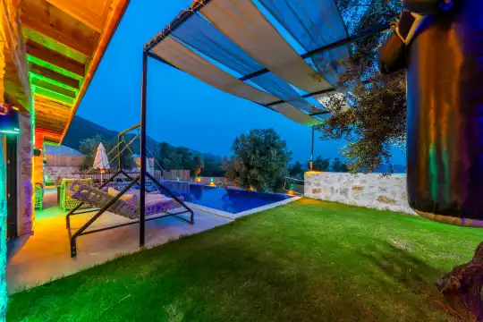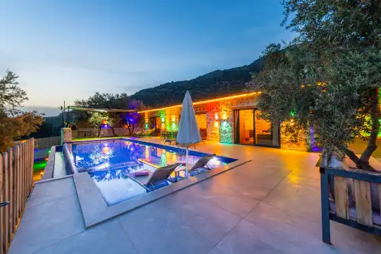 Kalkan Çayköy bölgesinde yer alan bu 2 yatak odalı, 5 kişilik tatil villası, misafirlerine keyifli olanaklar sunmaktadır. Villanın süit yatak odasında çift kişilik jakuzi ve akıllı yatak bulunurken, geniş bahçe alanında mini futbol, voleybol filesi, çocuk parkı, masa tenisi, langırt, kum torbası ve köşk gibi aktiviteler mevcuttur. Ayrıca, villa içinde okey takımı, tavla ve çeşitli kutu oyunları da keyifli vakit geçirmenizi sağlar.