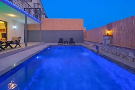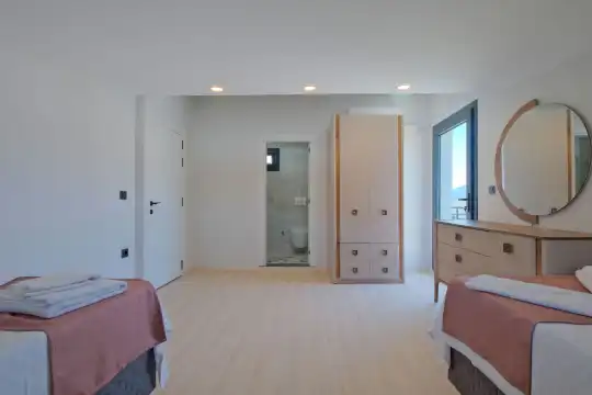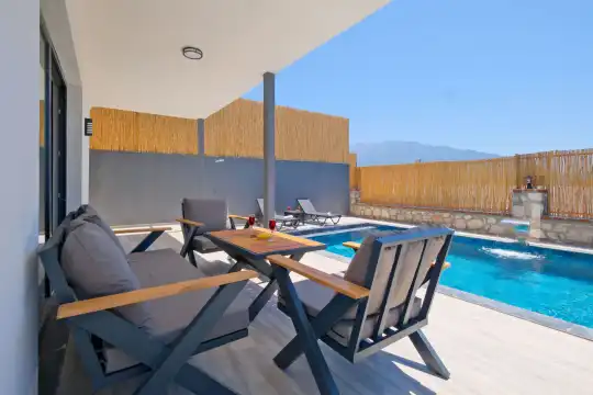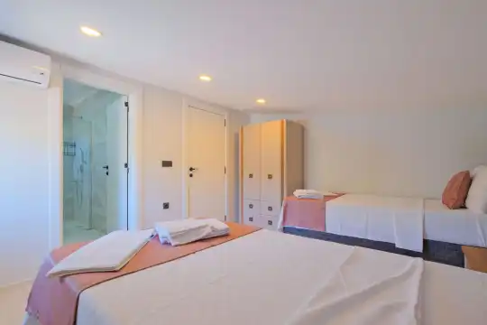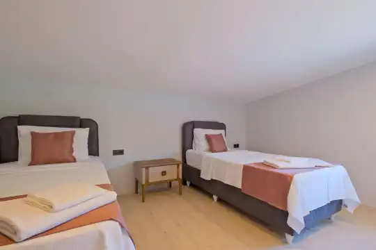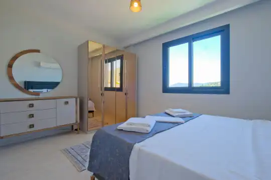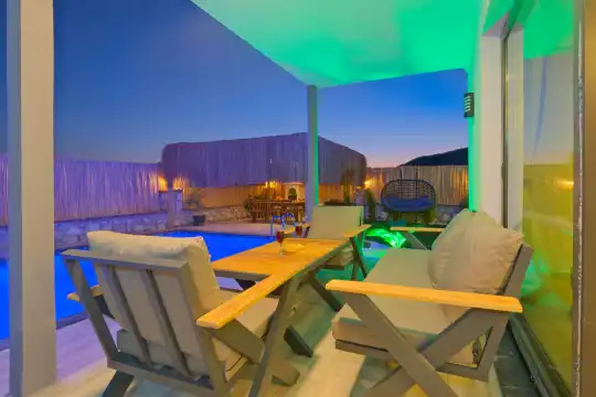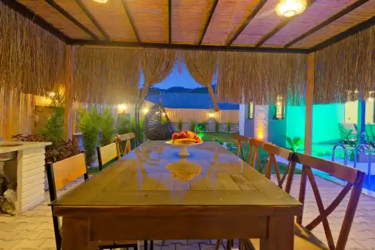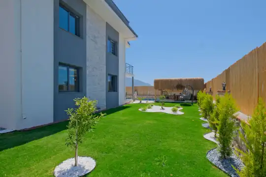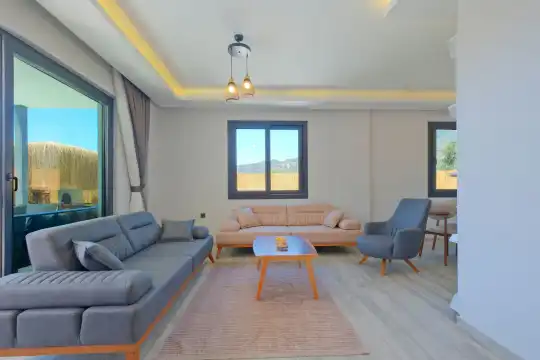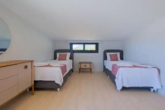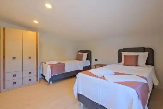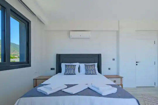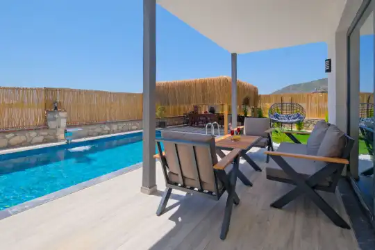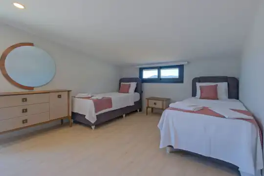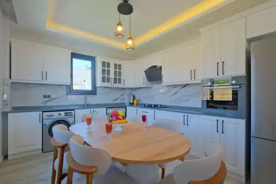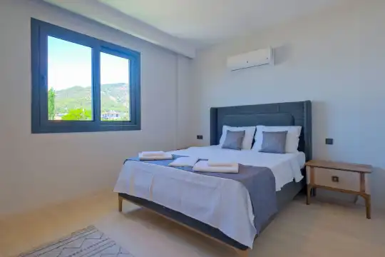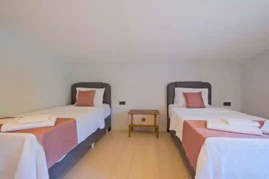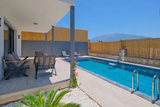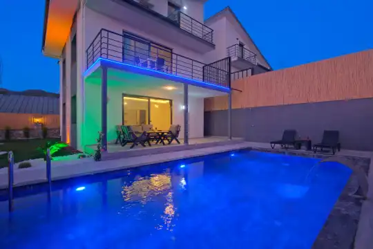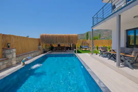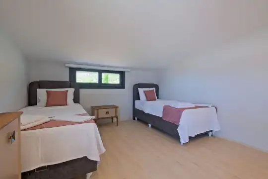 Fethiye Eldirek mevkiinde yer alan bu villa, dört yatak odası ve sekiz kişilik konaklama kapasitesiyle kalabalık odalar ve arkadaşlar için ideal bir seçenek sunuyor. Doğayla iç içe, huzurlu bir ortamda bulunan villa, özel havuz alanıyla birlikte tatilinizi daha da keyifli hale getiriyor. Havuz kapasitesi kapasitesine uygun odalar, oturma grubu ve banyo alanı yer alırken, havuz terasına açılan oturma odası ve tam donanımlı açık mutfak da misafirlerin konforu için düşünülmüş. Villanın birinci yatak odası çift kişilik yatak, ebeveyn odası ve jakuzi; ikinci yatak odası çift kişilik yatak ve ebeveyn odası; üçüncü ve dördüncü yatak ise ikişer tek kişilik yatak ve banyolar bulunmaktadır.