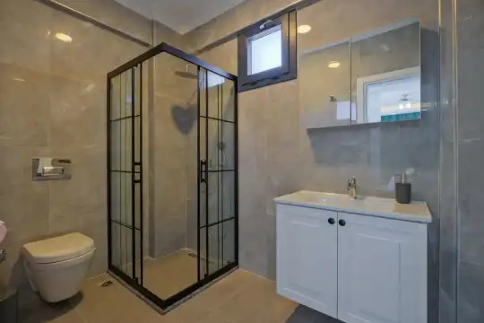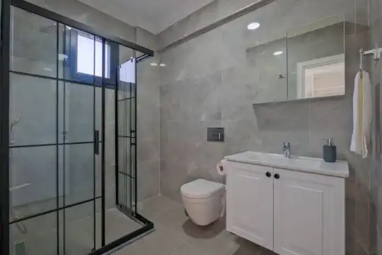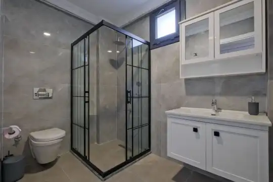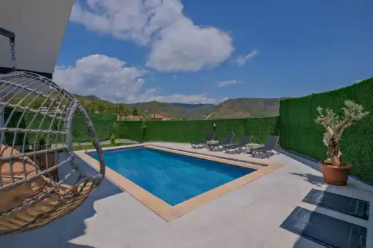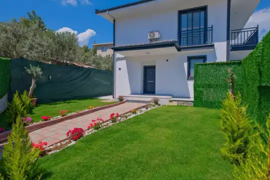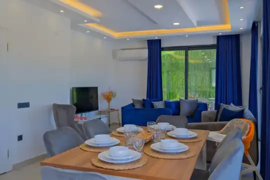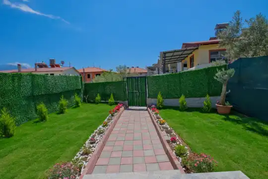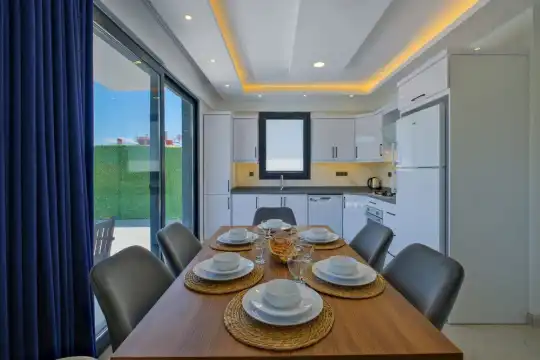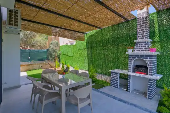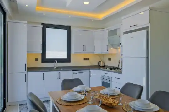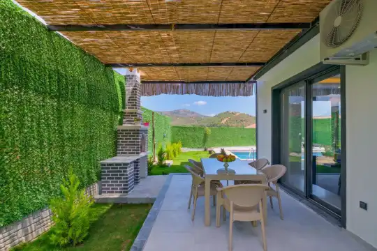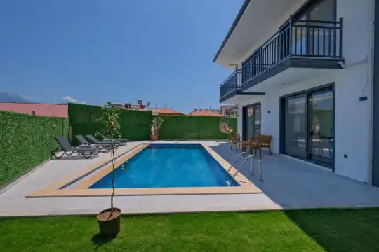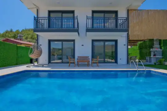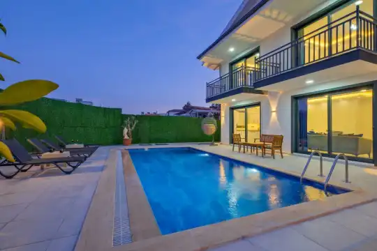 Modern ve ferah bir tasarıma sahip villa, geniş bahçesinde şezlong takımı, rahat bir oturma grubu, keyifli bir salıncak ve barbekü alanı sunuyor. Havuz terasına açılan konforlu oturma odası, tam donanımlı mutfağı ve şık mobilyalarıyla huzur dolu bir atmosfer sağlıyor. İki yatak odasında çift kişilik yatak ve ebeveyn banyosu, üçüncü yatak odasında ise iki tek kişilik yatak ve yine bir ebeveyn banyosu bulunuyor. İç mekânın modern detayları, misafirlerin konforu ön planda tutularak tasarlanmış.