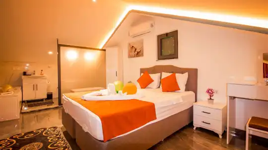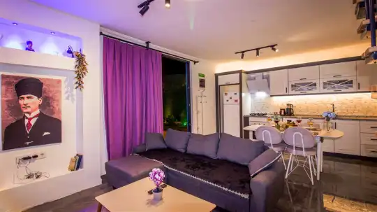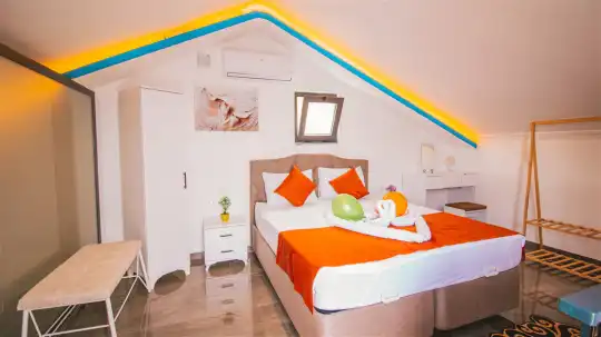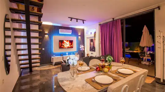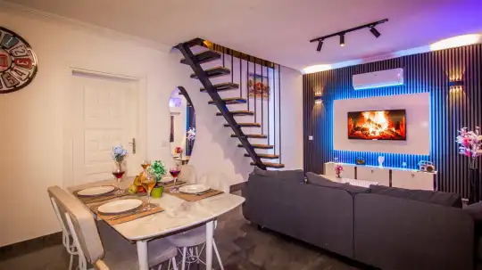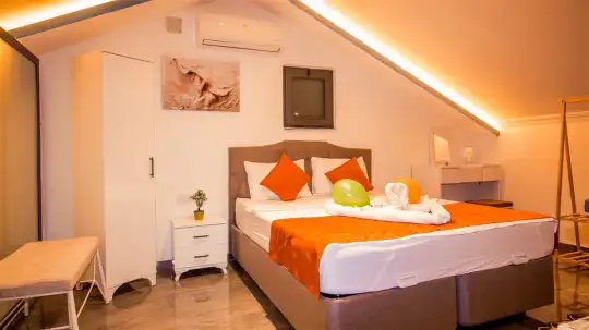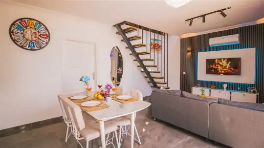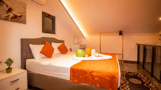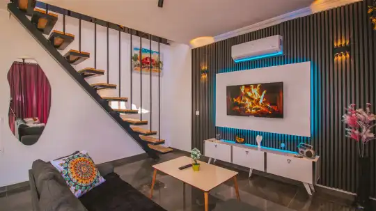 Villanın iç mekanları modern bir zevkle dekore edilmiş olup, yüksek kaliteli mobilya ve aksesuarlarla donatılmıştır. Geniş ve ferah yatak odalarının her birinde en-suite banyo bulunmakta, düzenli temizlik hizmetiyle konfor ön planda tutulmaktadır. Ayrıca tam donanımlı bir mutfak ve rahat bir oturma alanı da misafirlerin ev konforunda tatil geçirmesini sağlar.