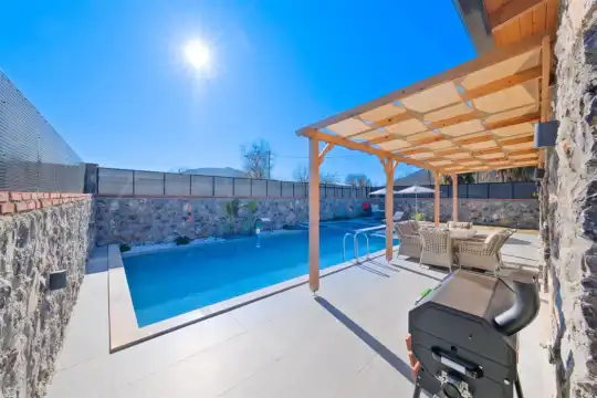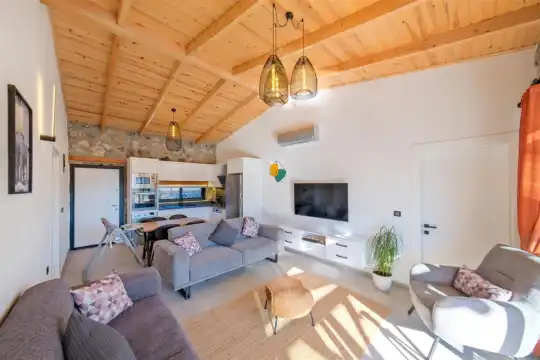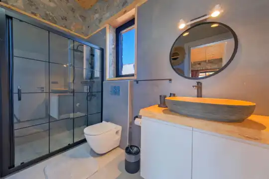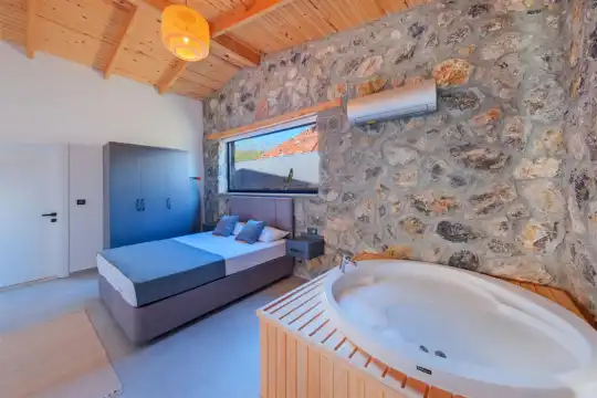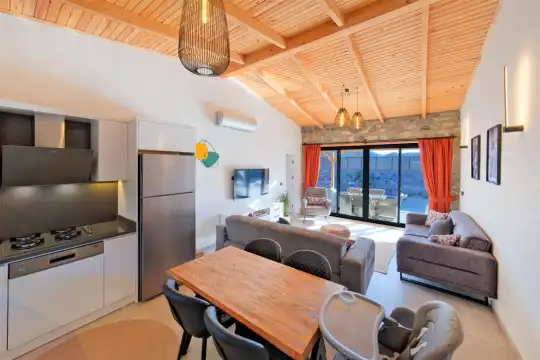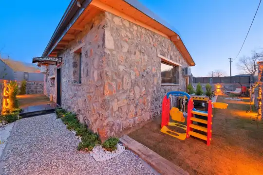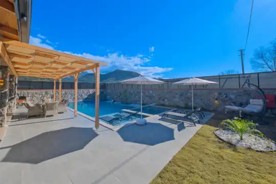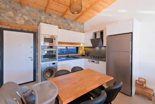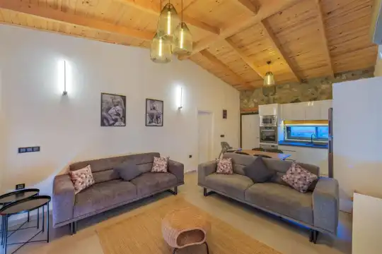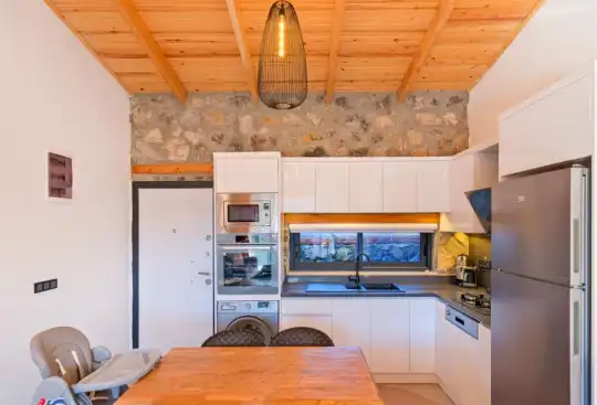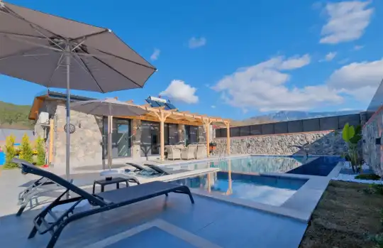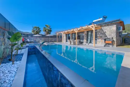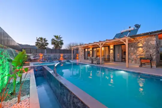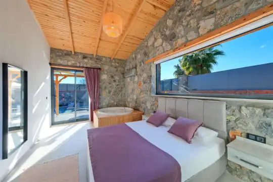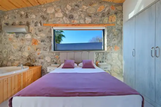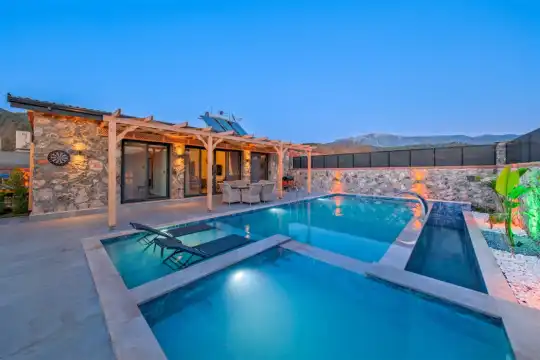 Fethiye Kayaköy'de bulunan bu villa, 2 yatak odasıyla 4 kişiye kadar konaklama imkanı sunmaktadır. Özellikle balayı çiftleri ve çekirdek ailelerin tercih ettiği bu villa, korunaklı havuz alanıyla dikkat çekmektedir. Çam ağaçlarıyla çevrili ve Kayaköy'ün muhteşem doğasına sırtını dayamış olan bu villa, doğal ve huzurlu bir konaklama deneyimi arayan misafirler için ideal bir seçenektir. Villanın bahçesi, Kayaköy'ün büyülü atmosferinden ilham alınarak tasarlanmıştır. Geniş havuz terasında, konukların rahatı düşünülerek şezlong takımı, konforlu oturma grubu, salıncak ve barbekü gibi olanaklar bulunmaktadır. Ayrıca, muhafazakar bir yapıya sahip olan havuz alanına açılan ferah oturma odası ve tam donanımlı açık mutfak, konukların konforunu ön planda tutmaktadır. İki yatak odasında çift kişilik yatak, ebeveyn banyosu ve jakuzi gibi özelliklerle donatılmış olan villa, misafirlerin ihtiyaçlarına eksiksiz bir şekilde cevap vermektedir.