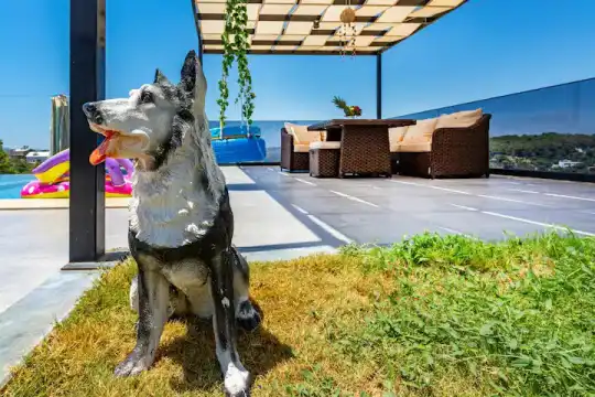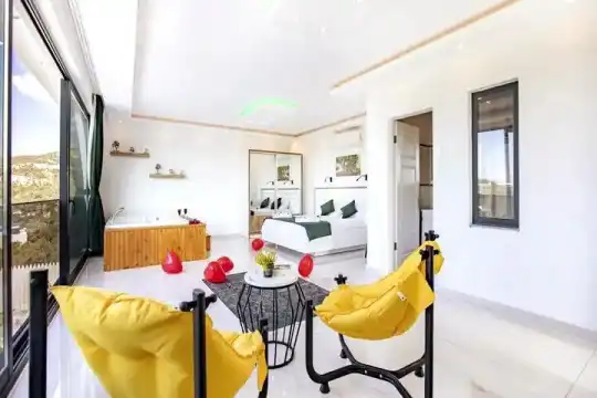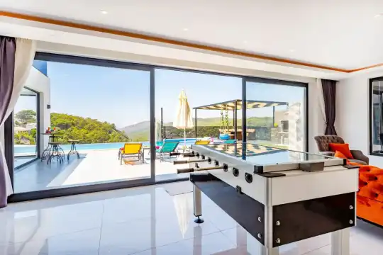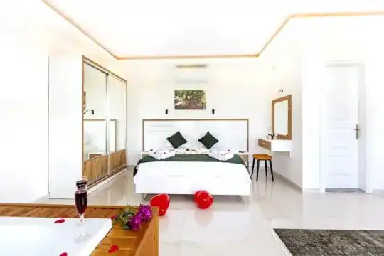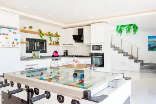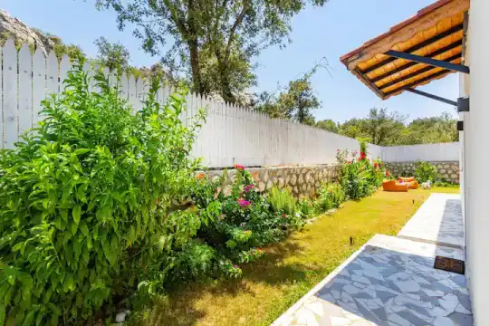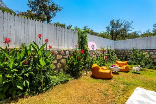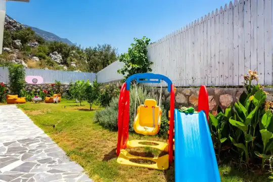 Jakuzili olan bu villa, yeşillerle çevrili bir bahçeye sahiptir ve renkli aktivitelerle doludur. Masa tenisi, dart, salıncak, langırt ve bar masası gibi eğlenceli aktiviteleri bulunan bahçe, tatilinizi dolu dolu geçirmenize imkan sağlar.