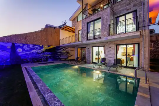 Villa Legendary 1, Seydikemer Kumluova mevkiinde, doğa ile iç içe, yeşilin her tonunun hakim olduğu huzurlu bir konumda yer almakta olup, 8 kişilik konaklama kapasitesine sahip dört yatak odasıyla misafirlerine harika bir tatil deneyimi sunuyor. Şehir gürültüsünden ve hava kirliliğinden uzak, sakin bir tatil arayanlar için mükemmel bir seçenek olan bu villa, korunaklı havuz terasıyla muhafazakar aileler için de oldukça uygun. İzole ve temassız bir tatil geçirmek isteyen misafirler için özenle dizayn edilen Villa Legendary 1, her detay düşünülerek hazırlanmış, konfor ve huzur dolu bir tatil vaat ediyor.