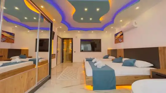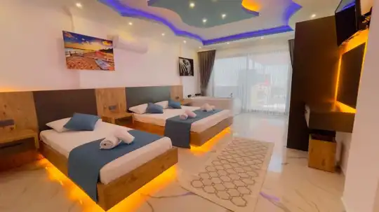 Villa Tabya, tek katlı bir yapıya sahip olup Kalkan'ın Yeşilköy bölgesinde konumlanmıştır. 2 yatak odası ve 5 kişilik konaklama kapasitesine sahip olan villamız, etrafı ağaçlarla çevrili ve perdeleme sistemi ile korunaklı hale getirilmiş bahçesinde havuz, şezlong, langırt, oturma köşesi ve yemek masası gibi olanaklar sunmaktadır. Korunaklı olması sayesinde muhafazakar çekirdek aileler ve balayı çiftleri için idealdir. Modern ve kaliteli eşyalarla dekore edilmiş villamızın her iki yatak odasında da jakuzi bulunmaktadır. Bahçedeki perdeleri açarak doğa manzarasını yakından izleyebilirsiniz.