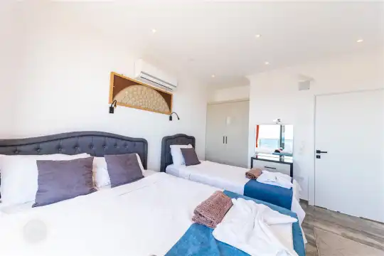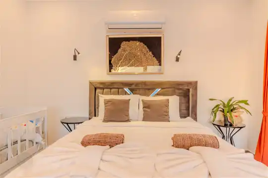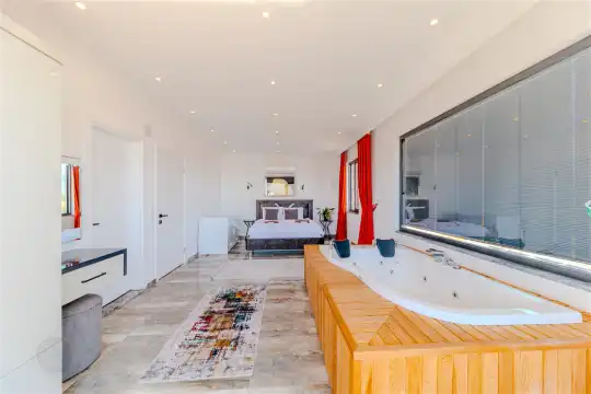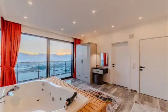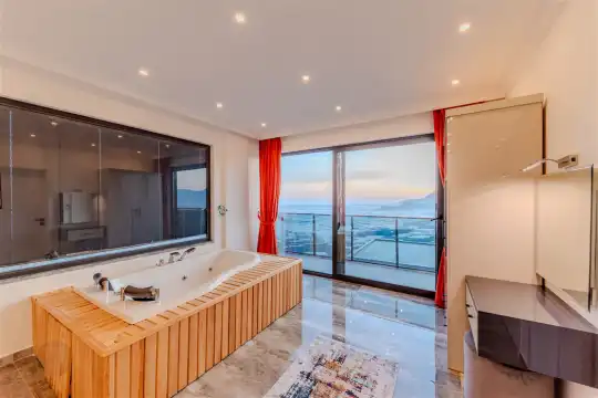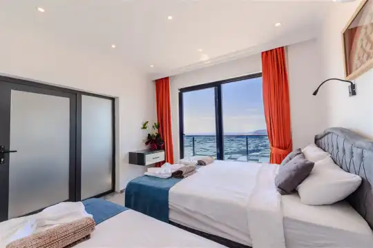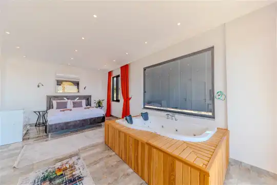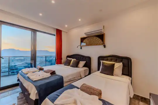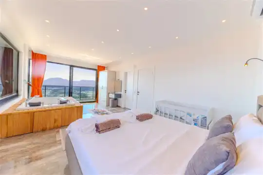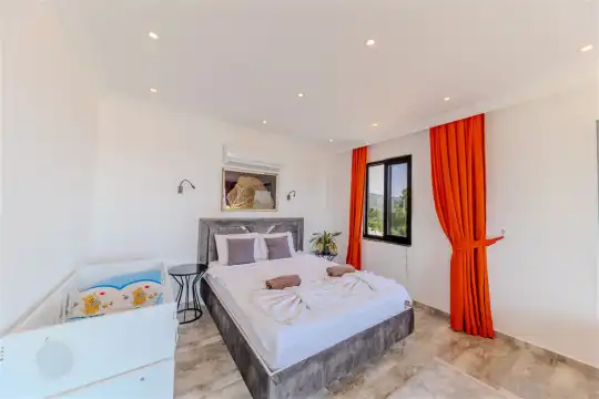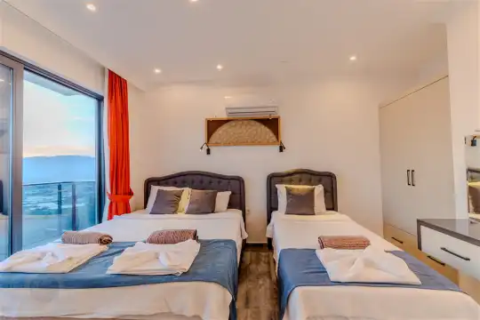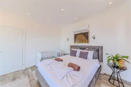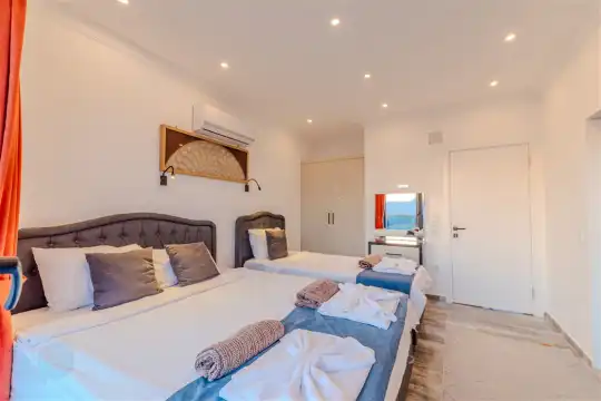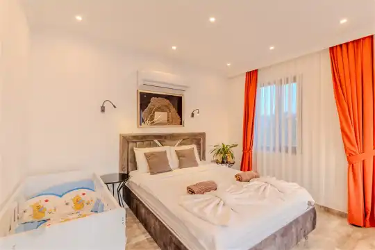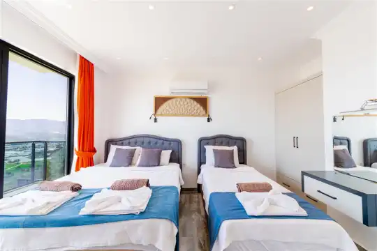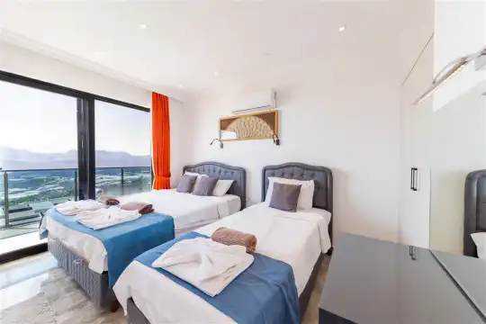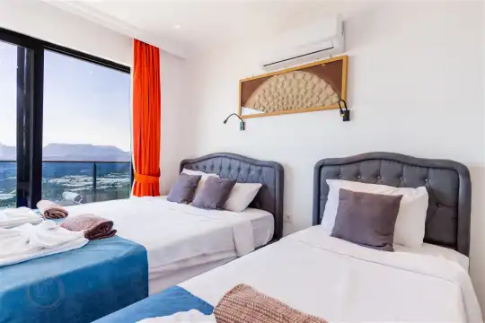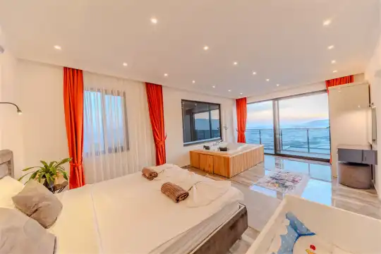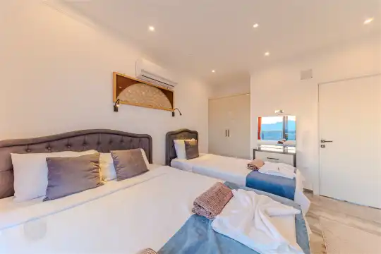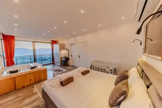 Villamız, muhteşem manzarası ile dikkat çeken lüks bir tatil seçeneğidir. 2 suit yatak odasıyla ve 1 ek yatak ile 5 kişiye kadar konaklama imkanı sunar. Ebeveyn yatak odasında çift kişilik yatak ve jakuzi bulunmaktadır; diğer yatak odasında ise 2 adet tek kişilik yatak mevcuttur. Her iki yatak odasında da özel banyo tuvalet ve klima bulunmaktadır.